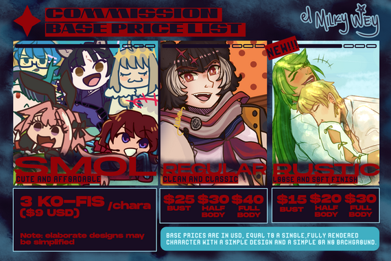 >graphic design (social media assets,static streaming assets,vtuber logos)Note: all of these are experimental commisions,meaning that as long as i don't list these in the price sheet above,they do not have set prices or delivery rates. A quote will be made to fit your order.*if the commisioner wants the piece delivered to them,they must provide a delivery address and cover shipping expenses. otherwise, a scanned copy of the commission will be sent digitally.